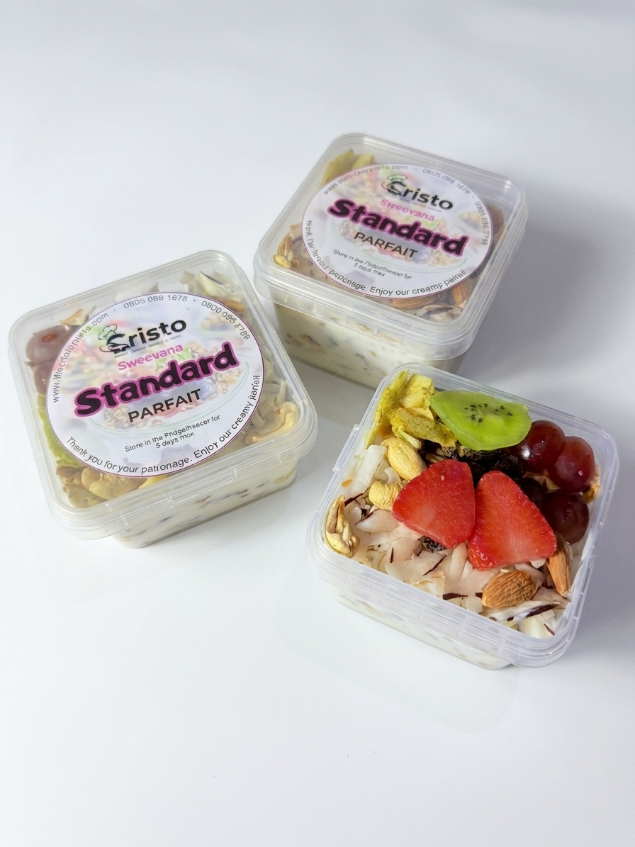 Contains Ten (10) solid ingredients (Seedless Grapes, Kiwi, Almond nut, Cashew nut, Granola, Strawberries, Raisins, Coconut flakes, Apple, and our Premium Signature Greek Yoghurt).
