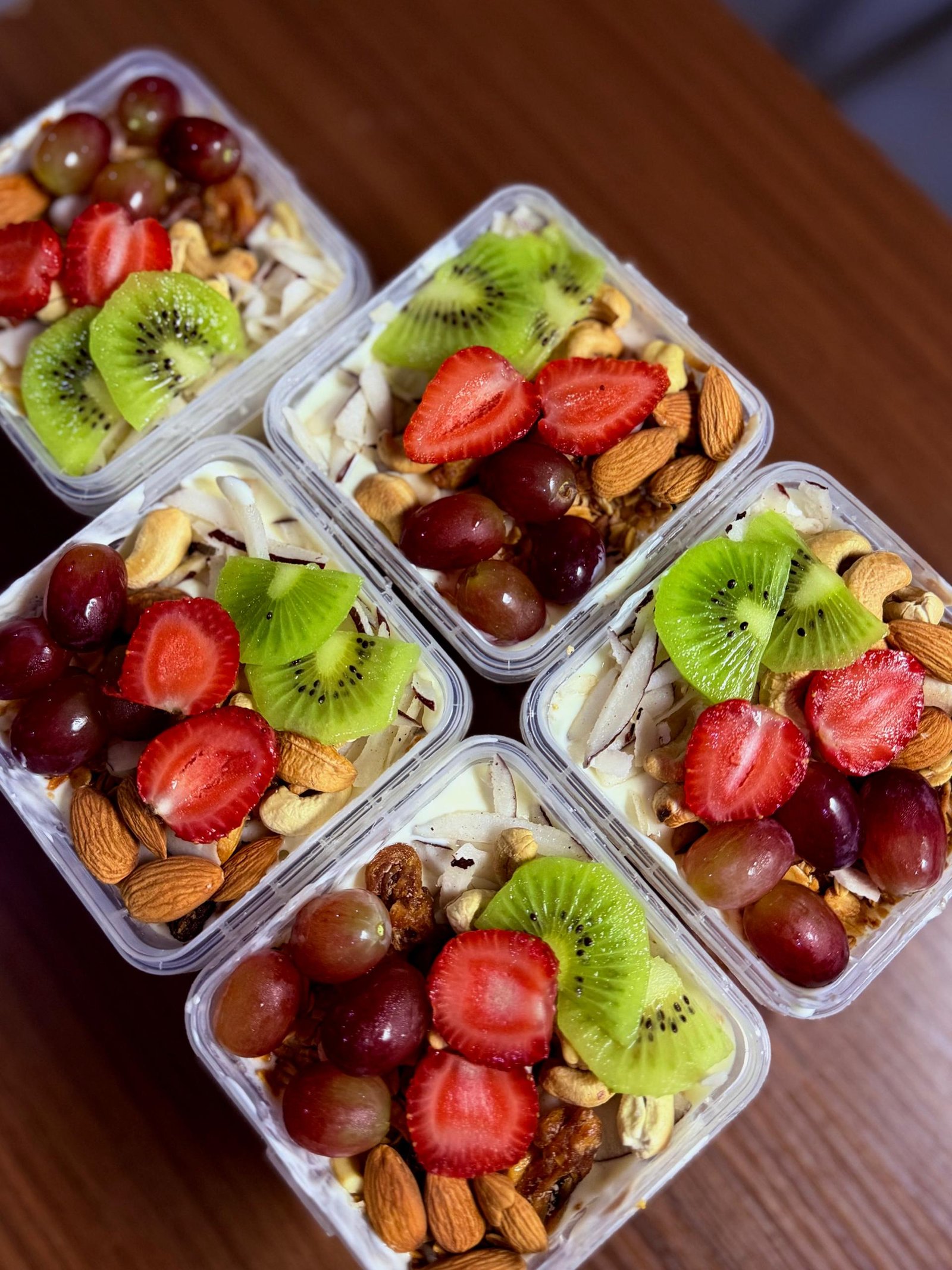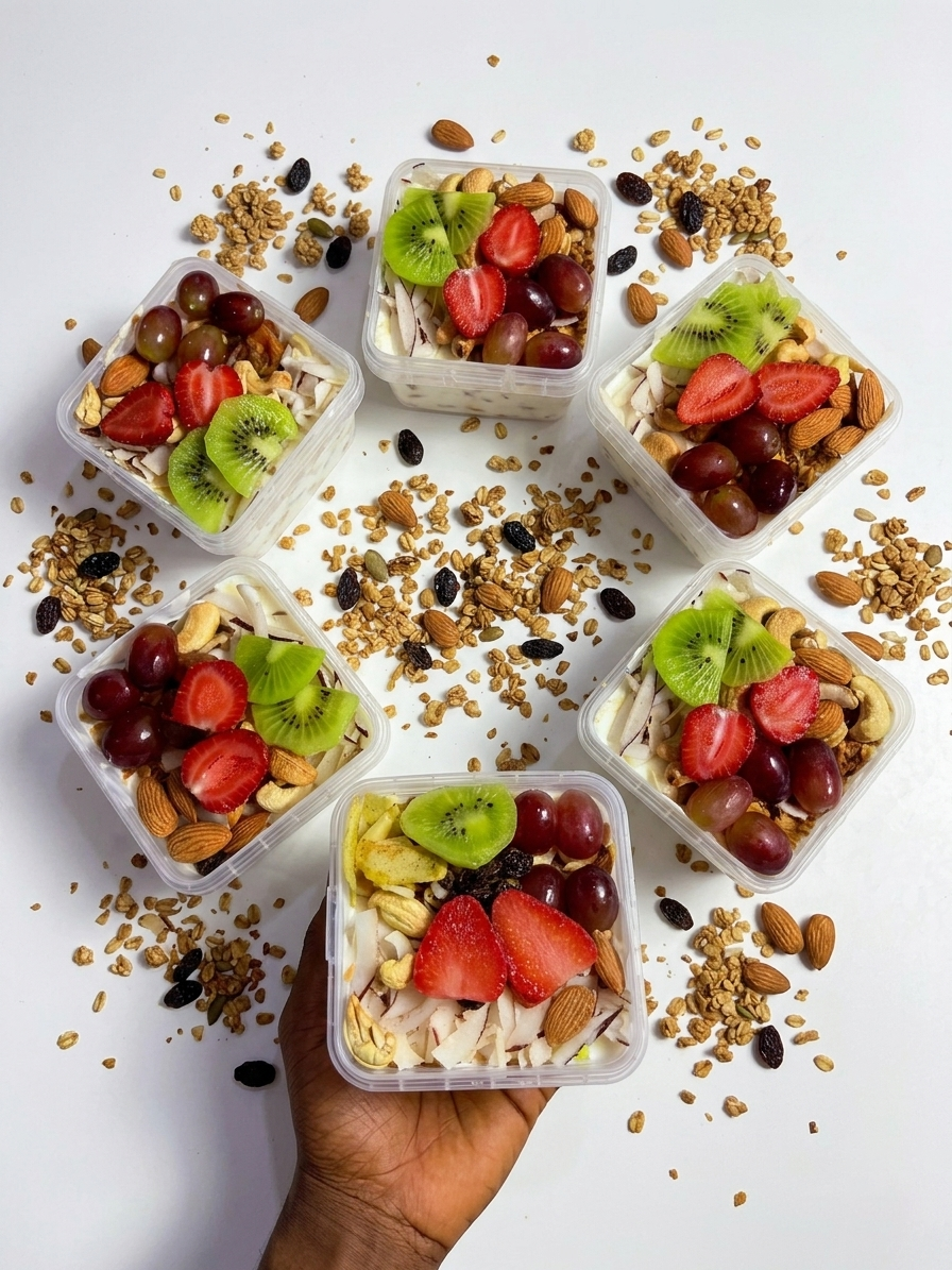 Contains Ten (10) solid ingredients (Seedless Grapes, Kiwi, Almond nut, Cashew nut, Granola, Strawberries, Raisins, Coconut flakes, Apple, and our Premium Signature Greek Yoghurt).